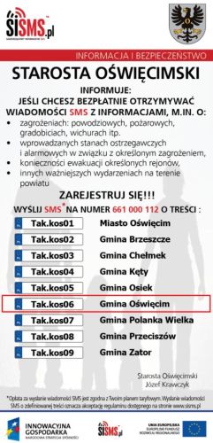 Starosta Oświęcimski informuje, że jeżeli chcesz BEZPŁATNIE otrzymywać wiadomości SMS z informacjami, m. in. o - zagrożeniach: powodziowych, pożarowych, gradobiciach, wichurach itp ....