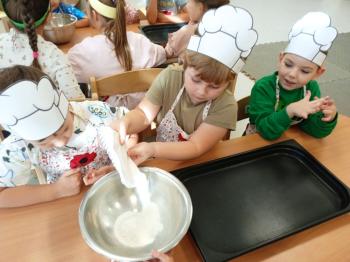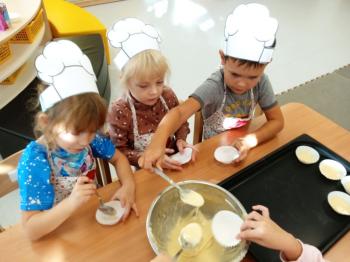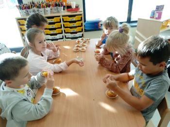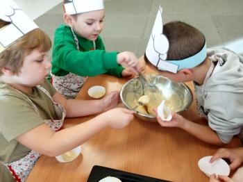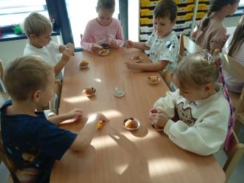 Podczas zajęć kulinarnych dzieci piekły babeczki. Z wielkim zaangażowaniem wykonywały kolejne polecenia, mieszały składniki, odliczały odpowiednie porcje składników, a po upieczeniu dekorowały swoje babeczki. Wszyscy z apetytem zjedli własnoręcznie wykonane smakołyki.