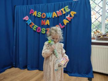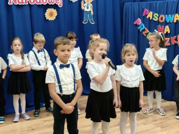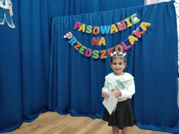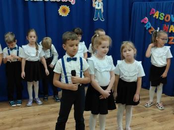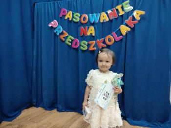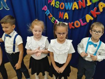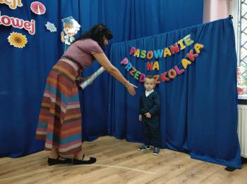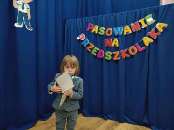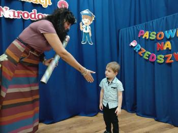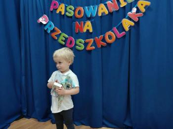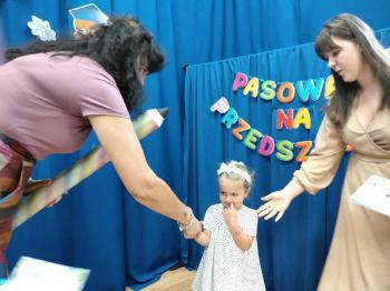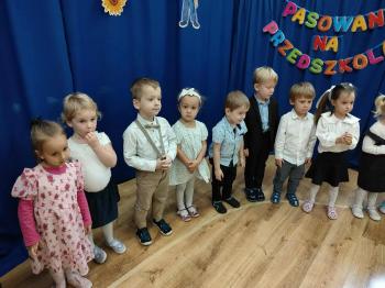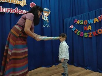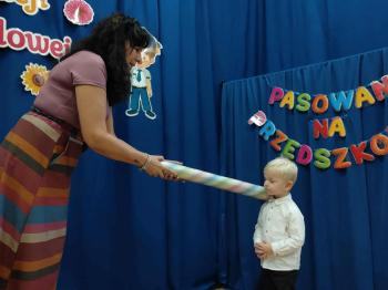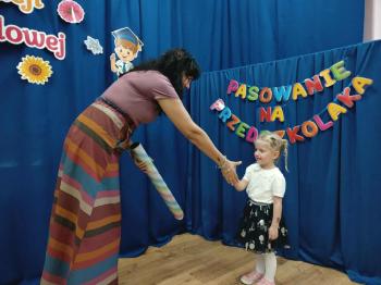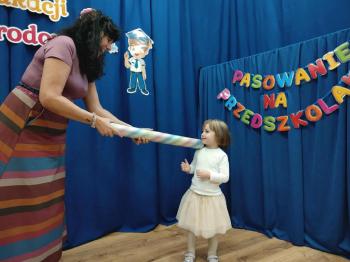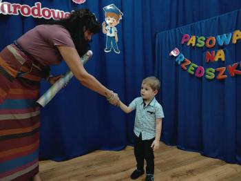 Najważniejszym momentem uroczystości było oczywiście Pasowanie na Przedszkolaka. Najmłodsze dzieci złożyły uroczyste przyrzeczenie, po czym pani dyrektor dokonała symbolicznego pasowania „czarodziejskim ołówkiem”.
